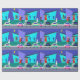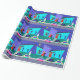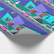 This Retro Holiday Cartoon Party Christmas Wrapping Paper will put you in the holiday spirit. The design features the exterior of a mid century modern house. Through the floor to ceiling turquoise glass walls, we can see the navy blue silhouettes of festive party goers. There is a couple chatting in front of a green Christmas tree, which is decorated with teal ornaments. On the opposite side of the room, we can see a dancing man and the long-winded man everyone is trying to avoid. The exterior of the house features a cheery red door with a holiday wreath, an oversize purple brick fireplace, and strands of colourful Christmas lights. A grey walkway is cutting a swath to the front door, through the teal grass. The nighttime scene has a dark blue sky with a yellow, crescent moon. The plastic snowman decorating the front yard is being greeted by the first snow flurries of the season. An attractive couple is doing the cha-cha-cha on the way to their car. The blonde woman is wearing a bright red dress. She is holding a sprig of mistletoe in one hand. Her handsome escort is wearing a black suit and a red tie. His hands are wrapped around the woman's waist. On the street, in front of the house, we can see three, brightly coloured classic cars. Order today and party like it's 1959!