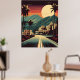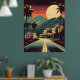 In the background, there are rolling mountains under a dusky sky, with the sun hanging low and large, casting a soft light over the scene. The overall atmosphere of the image is one of a tranquil, exotic getaway at sunset. The artwork could be associated with travel, leisure, or the allure of paradise.