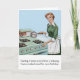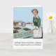 A vintage image of a retro housewife from the 1950s or 1960s. She's standing in front of her turquoise stove, wearing a dress and apron, and holding a small pot over one of the stove burners. She smiles sweetly, turns and says to her husband, "Darling, I know you’d love a relaxing, home cooked meal for your birthday." On the inside of the card: "So I called your mum."