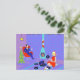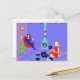 This Retro Home for the Holidays Postcard looks like a scene out of a 1960's television Christmas special. The minimalist design features an attractive cartoon couple in the living room of a mid century modern house. The room prominently features a purple and blue stone wall and a matching purple and blue striped rug. Against the wall, there is a turquoise cone shaped fireplace with a roaring fire. Two, red and white Christmas stockings have been hung by the mod chimney with care. Strands of colourful Christmas lights are strung across the top of the wall. In the corner, the suave man of the house is lounging in a red egg chair. He is wearing a blue suit with a red tie. There is a sprig of holly pinned to his lapel. In one hand, he is holding a martini glass. No wonder he's so full of the Christmas spirit! Beside him, there is a small, green Christmas tree with teal ornaments and a yellow star. Hanging from the ceiling, there is a yellow Sputnik light fixture. A blonde with an hourglass figure is sitting on the rug. She is wearing a festive, red dress and Santa hat. Beside her, on the floor, there is a blue and black portable record player. Several Christmas albums are scattered near the beautiful deejay. Go ahead and sing along. You know you want to!