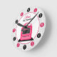 A clock featuring an illustration of a retro hot pink kitchen stove. Personalise with your name about illustration. Clock features white numbers on pink and black dots.