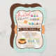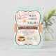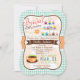 Cute, colourful cupcake tree and tea cup bridal shower invitation on retro white and robins egg blue, teal green houndstooth pattern. Features, pink, yellow, blue, green, purple, brown, white, and orange cupcakes with pink, green, and brown tea cup, teacup, coffee cup, and pink and yellow flower. Great for tea party theme bridal showers! Vintage bracket shaped invite.