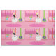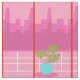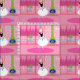 This Retro In the Pink Fabric looks like a scene out of a 1960's romantic comedy. The minimalist design shows a sophisticated woman in her ultra kitschy and ultra pink, penthouse apartment. The room features a pink brick wall with white grout lines. In front of the wall, there is a green cone fireplace with a roaring fire. Through sliding glass doors we see a pink balcony with a white railing. A lush, tropical plant is in an aqua flowerpot. The view from the balcony is of a silhouette of a big city skyline. Of course, the silhouette is in shades of pink! A yellow, crescent moon is in the sky. Standing on a hot pink, shag rug in the apartment is the leading lady of this design. In stark contrast to the rosy world she has created, the beautiful blonde is wearing a form fitting, black, scoop-necked top with a long, flared, white skirt with black feather embellishments. With this design, you too can be looking at the world through rose coloured glasses!