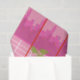 This Retro In the Pink Tissue Paper looks like a scene out of a 1960's romantic comedy. The minimalist design shows a sophisticated woman in her ultra kitschy and ultra pink, penthouse apartment. The room features a pink brick wall with white grout lines. In front of the wall, there is a green cone fireplace with a roaring fire. Through sliding glass doors we see a pink balcony with a white railing. A lush, tropical plant is in an aqua flowerpot. The view from the balcony is of a silhouette of a big city skyline. Of course, the silhouette is in shades of pink! A yellow, crescent moon is in the sky. Standing on a hot pink, shag rug in the apartment is the leading lady of this design. In stark contrast to the rosy world she has created, the beautiful blonde is wearing a form fitting, black, scoop-necked top with a long, flared, white skirt with black feather embellishments. With this design, you too can be looking at the world through rose coloured glasses!