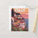Capture the romantic beauty of Italy with this vintage-style postcard featuring a stunning Italian seaside village at sunset. The design, reminiscent of classic travel posters, showcases charming coastal homes, lush greenery, and the iconic Italian umbrella pine against a soft, colourful sky. Perfect for anyone who loves Italy, the Mediterranean, or vintage travel art. This postcard is ideal for sending a special message, collecting as a souvenir, or framing as a beautiful piece of retro wall art.