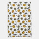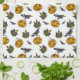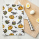 This fun kitchen towel features retro Jack o' Lantern trick or treat buckets, ravens, and and festive black cats set on a white background.