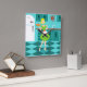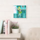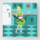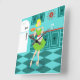 With this Retro Kitchen Acrylic Wall Clock, you can have your pie and eat it, too. This kitschy, minimalist art drawing features a perfect 1950's housewife, in her mid century modern kitchen. The beautiful baker is wearing a flouncy, green dress and a white apron with red detailing. Not a hair on her blonde head is out of place. In one hand, she is holding the fruit of her labour--a gorgeous, lattice topped, fruit pie. One glance and you'll know that her flaky pie crusts are second to none. She is standing on an aqua and teal chequerboard floor, which is undoubtedly clean enough to eat off of. Against an aqua wall, we see teal cabinetry with aqua trim work, a red countertop, red drawer pulls, and black starburst accents. A red, starburst clock is hanging on the wall. To the side, there is a state of the art, white refrigerator with silver handles. At least, the fridge was state of the art in 1950's. Now, it's just plain dreamy! Whether you're Suzie Homemaker or simply have an affinity for all things vintage, you're sure to love this scrumptious slice of Americana.