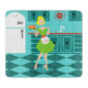 With this Retro Kitchen Cutting Board, you can have your pie and eat it, too. This kitschy, minimalist art drawing features a perfect 1950's housewife, in her mid century modern kitchen. The beautiful baker is wearing a flouncy, green dress and a white apron with red detailing. Not a hair on her blonde head is out of place. In one hand, she is holding the fruit of her labour--a gorgeous, lattice topped, fruit pie. One glance and you'll know that her flaky pie crusts are second to none. She is standing on an aqua and teal chequerboard floor, which is undoubtedly clean enough to eat off of. Against an aqua wall, we see teal cabinetry with aqua trim work, a red countertop, red drawer pulls, and black starburst accents. A red, starburst clock is hanging on the wall. To the side, there is a state of the art, white refrigerator with silver handles. At least, the fridge was state of the art in 1950's. Now, it's just plain dreamy! Whether you're Suzie Homemaker or simply have an affinity for all things vintage, you're sure to love this scrumptious slice of Americana.