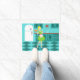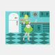 With this Retro Kitchen Door Mat, you can have your pie and eat it, too. This kitschy, minimalist art drawing features a perfect 1950's housewife, in her mid century modern kitchen. The beautiful baker is wearing a flouncy, green dress and a white apron with red detailing. Not a hair on her blonde head is out of place. In one hand, she is holding the fruit of her labour--a gorgeous, lattice topped, fruit pie. One glance and you'll know that her flaky pie crusts are second to none. She is standing on an aqua and teal chequerboard floor, which is undoubtedly clean enough to eat off of. Against an aqua wall, we see teal cabinetry with aqua trim work, a red countertop, red drawer pulls, and black starburst accents. A red, starburst clock is hanging on the wall. To the side, there is a state of the art, white refrigerator with silver handles. At least, the fridge was state of the art in 1950's. Now, it's just plain dreamy! Whether you're Suzie Homemaker or simply have an affinity for all things vintage, you're sure to love this scrumptious slice of Americana.