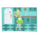 With this Retro Kitchen Pillowcase, you can have your pie and eat it, too. This kitschy, minimalist art drawing features a perfect 1950's housewife, in her mid century modern kitchen. The beautiful baker is wearing a flouncy, green dress and a white apron with red detailing. Not a hair on her blonde head is out of place. In one hand, she is holding the fruit of her labour--a gorgeous, lattice topped, fruit pie. One glance and you'll know that her flaky pie crusts are second to none. She is standing on an aqua and teal chequerboard floor, which is undoubtedly clean enough to eat off of. Against an aqua wall, we see teal cabinetry with aqua trim work, a red countertop, red drawer pulls, and black starburst accents. A red, starburst clock is hanging on the wall. To the side, there is a state of the art, white refrigerator with silver handles. At least, the fridge was state of the art in 1950's. Now, it's just plain dreamy! The opposite side of this fun pillowcase is aqua and can be personalised. Whether you're Suzie Homemaker or simply have an affinity for all things vintage, you're sure to love this scrumptious slice of Americana.