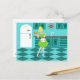 With this Retro Kitchen Postcard, you can have your pie and eat it, too. This kitschy, minimalist art drawing features a perfect 1950's housewife, in her mid century modern kitchen. The beautiful baker is wearing a flouncy, green dress and a white apron with red detailing. Not a hair on her blonde head is out of place. In one hand, she is holding the fruit of her labour--a gorgeous, lattice topped, fruit pie. One glance and you'll know that her flaky pie crusts are second to none. She is standing on an aqua and teal chequerboard floor, which is undoubtedly clean enough to eat off of. Against an aqua wall, we see teal cabinetry with aqua trim work, a red countertop, red drawer pulls, and black starburst accents. A red, starburst clock is hanging on the wall. To the side, there is a state of the art, white refrigerator with silver handles. At least, the fridge was state of the art in 1950's. Now, it's just plain dreamy! Whether you're Suzie Homemaker or simply have an affinity for all things vintage, you're sure to love this scrumptious slice of Americana.