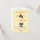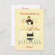 Vintage illustration of woman in apron preparing treats in her old-fashioned black and white kitchen. Recipe card. Retro. Black, white, cream, red. Personalise.