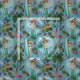 Multicolored retro surf tropical themed graphics on a teal background, seamless repeat pattern