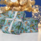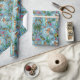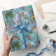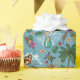 Multicolored retro surf tropical themed graphics on a teal background, seamless repeat pattern
