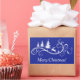 This is a delightful retro style swirl Holiday image with a leaping reindeer and pine trees. The image is white on a bright blue background. Below the image is typographical text that says "Merry Christmas"