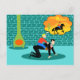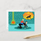 Yeehaw! You'll be ready to ride off into the sunset with this Retro Little Cowboy Postcard. This whimsical design features a vibrant, 1960's style, minimalist, cartoon drawing of a father and his young son having rip-roaring, good time. The scene takes place in their mid century modern living room, which has an aqua floor and a wall of teal and aqua bricks. The rowdy youngster is wearing a red shirt, blue jeans, and brown cowboy boots. That's the perfect attire for getting a make believe horsey back ride from his indulgent father. Dad appears to have just arrived home after a long day at the office. He is wearing a black suit, white dress shirt, and red tie. He still has the energy to crawl around the room on all fours, while his favourite blonde cowboy enjoys riding the range. But the young cowpoke has his mind on another time and place. With the help of a thought bubble, we can see exactly what is on Junior's mind. He is envisioning himself riding through a yellow and orange desert on a sleek, black stallion. The cowboy of his mind is wearing a brown cowboy had to protect him from the searing sun. Behind him is a green cactus, which is eerily reminiscent of the green cone fireplace back in his own family home. I imagine that both horse and rider are working up a real appetite for dinner at a chuck wagon. Where is Mum with that dinner bell?