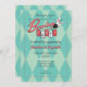Bowling Party Invitation features the typography "Bowling Party" in a retro, modern 50's style logo, with illustrated bowling ball and pins. Incorporating elements of blue, red, white, and grey, dots, and a diamond patterned background. Includes template for personal customisation.