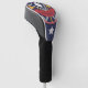 This golf head cover features a retro style circle logo which includes a golf tee with ball, flags, clubs and stars. Colours used include grey blue, white, and gold. Across the logo is a red banner with your name. A white star at the bottom completes the design, and everything is placed on a navy blue background.