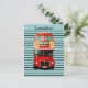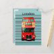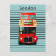 Cutout photo of bright red London bus of the Routemaster type on background of black lines and peppermint green with title 'London'.