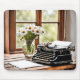 Old-fashioned manual typewriter with daisy bouquet on wooden desk by sunny window