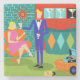 This Retro Martini Couple Stone Coaster looks like a scene out of a romantic comedy. The setting of this 1960's style, minimalist art design is an elegantly decorated, mid century modern house or apartment. The cast is an attractive couple enjoying an evening filled with sparkling conversation, good music and bottomless drinks. The room features a green floor, and an aqua and teal brick wall. Resting comfortably in a mod, orange egg chair is a beautiful woman. Her bright pink dress is just short enough to show off her shapely gams. With the wave of a hand, this blonde beauty has the immediate attention of her male admirer. Her fair haired companion is wearing a blue suit, white shirt and black bow tie. In his hands, he is holding two, crystal martini glasses with floating olives. Don't worry. He's offering one to his lady friend. The pair is having such a delightful time that neither is taking notice of the hour showing on the kitschy, red, starburst clock on the brick wall behind them. On a recessed fiery red wall, there are three Classic Movie Martini Stretched Canvas Prints, also available from StrangeLittleOnion's Zazzle store (hint, hint!) Two of the prints feature turquoise backgrounds and one is on a dramatic black background. Centred beneath the prints is an elegant wet bar. The front of the teal bar has three harlequin diamonds, in shades of orange, turquoise and green. We can see the silhouettes of martini glasses resting on the counter top. Across the room, an orange ottoman is holding a blue and black, portable record player. On the floor, we see the vinyl records and a bright yellow album cover. This attractive duo is having such a delightful time that neither is taking notice of the hour showing on the kitschy, red, starburst clock on the brick wall behind them.