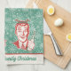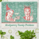 Celebrate Christmas in retro 1950s mid-century modern style with this pretty kitchen towel. The design includes a vintage-looking woman wearing a Santa hat and holding a martini glass, and a man wearing a reindeer antler hat and holding a champagne bottle. The background is teal with snowflakes. Use the easy template to personalise your name along the bottom edge of the towel. The design appears twice (on the front side of the towel), so it will show with either edge facing out when hung folded in half on a kitchen or bathroom towel rack. Enjoy the matching holiday invitations found here: https://www.zazzle.com/christmas_party_retro_midcentury_winter_xmas_humor_invitation-256399088616443134