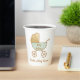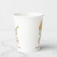 Cute gender-neutral baby shower paper cups that feature a pastel mint green and gold retro baby carriage watercolor and the mother-to-be's name in a stylish script. Personalise the text on the baby carriage or leave blank.