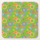 Bright and colourful throwback pattern features multi-ringed circles of a variety of sizes and colours on grass green background.