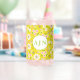 Bright and sunny throwback pattern features white flowers with pink and green centres on yellow background.  Personalise this trendy can glass with monogram or name in white and green oval