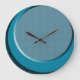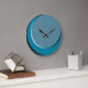 Retro modern blue 1950's look vintage style wall clock. It's in the shape of a crescent moon and has a abstract interior circle design.