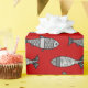 Mid-Century Modern, whimsical, retro fish pattern wrapping paper, in shades of light silver grey / grey to deep graphite grey on a deep lipstick red background