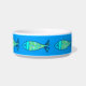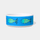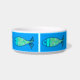 Mid-Century Modern, whimsical, retro fish pattern pet bowl, in turquoise, aqua, lime green and sky blue, on a deep cerulean blue background