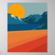 This stylish poster features a colourful and bold illustration of a retro mountain landscape in red, orange, and blue.