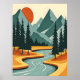 This stylish poster features a colourful and bold illustration of a retro mountain landscape in red, orange, and blue.