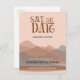This save the date postcard is perfect for a destination wedding in the mountains. It features retro-inspired type that reads "Save the Date" and modern screenprint-like graphic of layered mountains in soft neutral colours. The front has a place to include the wedding weekend dates, couple's names and the wedding location and wedding website address. The back is setup as a postcard for easy mailing.