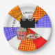 Red, blue, yellow, white, red gender neutral movie night themed birthday party paper plates in a hand drawn pop art digital art style.