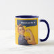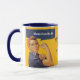 This mug features the vintage World War II poster image of Rosie the Riveter showing her arm strength, and the caption which says, "Mum Can Do It!" The image is primarily in colourful blue and gold. The customisable text in the centre currently says "Best Mum Ever" and "Mother's Day 20XX" but can be easily changed or removed.