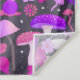 This tapestry is decorated with trippy, psychedelic illustrated mushrooms and flowers in shades of hot pink and bold purple against a black background.