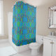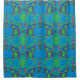Bring electrifying energy to your bathroom with this vibrant neon-patterned shower curtain.  A matrix of curving green and purple lines forms a futuristic circuit-like motif across a bold blue background, accented by flashes of vivid red.  The symmetrical, almost sci-fi aesthetic evokes a blend of '80s arcade vibes and abstract architecture.  Perfect for modern interiors or those who love retro-futurist style.