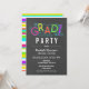 Graduation party invitation with a cool 90s inspired design in neon colours with doodles and stripes against a chalkboard background.