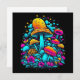 Colourful neon art with blue and pink mushrooms and flowers and a black background.