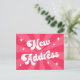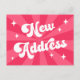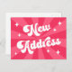 New address moving announcement postcards featuring white text "New address" in a fun, retro font surrounded by retro stars on a pink sunburst background. Add your new address on the back. The text on the back is customisable.
