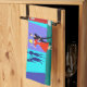 This Retro Open House Party Kitchen Towel will put you in the partying mood. The cartoon design features the exterior of a mid century modern house. Through the floor to ceiling turquoise glass walls, we can see the navy blue silhouettes of festive party goers. There is a couple chatting in front of a window. On the opposite side of the room, we can see a dancing man and the long-winded man everyone is trying to avoid. The exterior of the house features a cheery red door and an oversize purple brick chimney. A grey walkway is cutting a swath to the front door, through the teal grass. The nighttime scene has a dark blue sky with a yellow, crescent moon. An attractive couple is doing the cha-cha-cha on the way to their car. The blonde woman is wearing a bright red dress. Her handsome escort is wearing a black suit and a red tie. His hands are wrapped around the woman's waist. On the street, in front of the house, we can see three, brightly coloured classic cars. Order today and party like it's 1959!