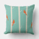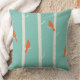 A pillow with an illustration of birch trees with orange birds sitting on their branches. Retro green coloured background.