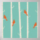 A poster with an illustration of birch trees with orange birds sitting on their branches. Retro green coloured background.
