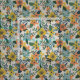 Retro floral fabric featuring flowers in yellow, orange, and blue among greenery and berries. A retro floral pattern for your projects.