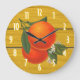 A retro kitchen wall clock with white and yellow numbers and vintage art of two ripe oranges on a branch with small white blossoms flowering against green leaves on a rustic faux wood background.  Customise It to change background colours, sizing, add your name or message and more.