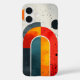 Featuring a retro colour palette of orange, red, and teal, this phone case showcases an arched rainbow over a star-speckled dark sky, evoking a feeling of nostalgia and cosmic mystery.