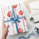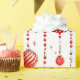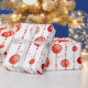 This wrapping paper features a repeating pattern of red and white Christmas ornaments hanging from vertical strings of red beads. There are also small, stylised red stars scattered throughout the white background. Some ornaments are solid red, while others have red and white stripes.