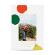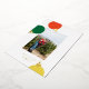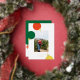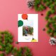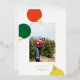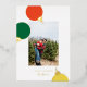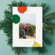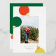 A modern holiday card design featuring 3 retro style ornaments in red, green and yellow surrounding a personalised photo above a custom seasonal greeting and signature.